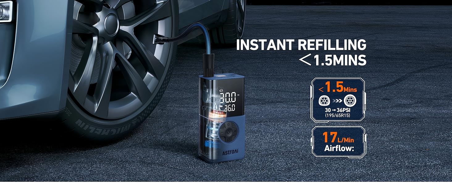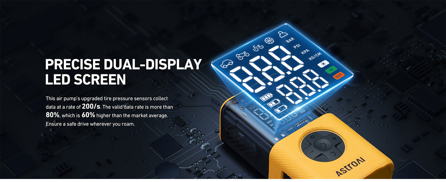 Stay prepared for every drive with the Portable Tire Inflator & Power Bank, engineered for accuracy, speed, and total convenience. Featuring an advanced sensor system that analyzes tire pressure 200 times per second, this inflator delivers highly precise readings with an 80% valid data rate—far surpassing the market standard. Its powerful 150 PSI output and 17L/min airflow deliver inflation speeds up to 2× faster than typical portable pumps, refilling a 195/65R15 tire from 30–36 PSI in just 1.5 minutes.