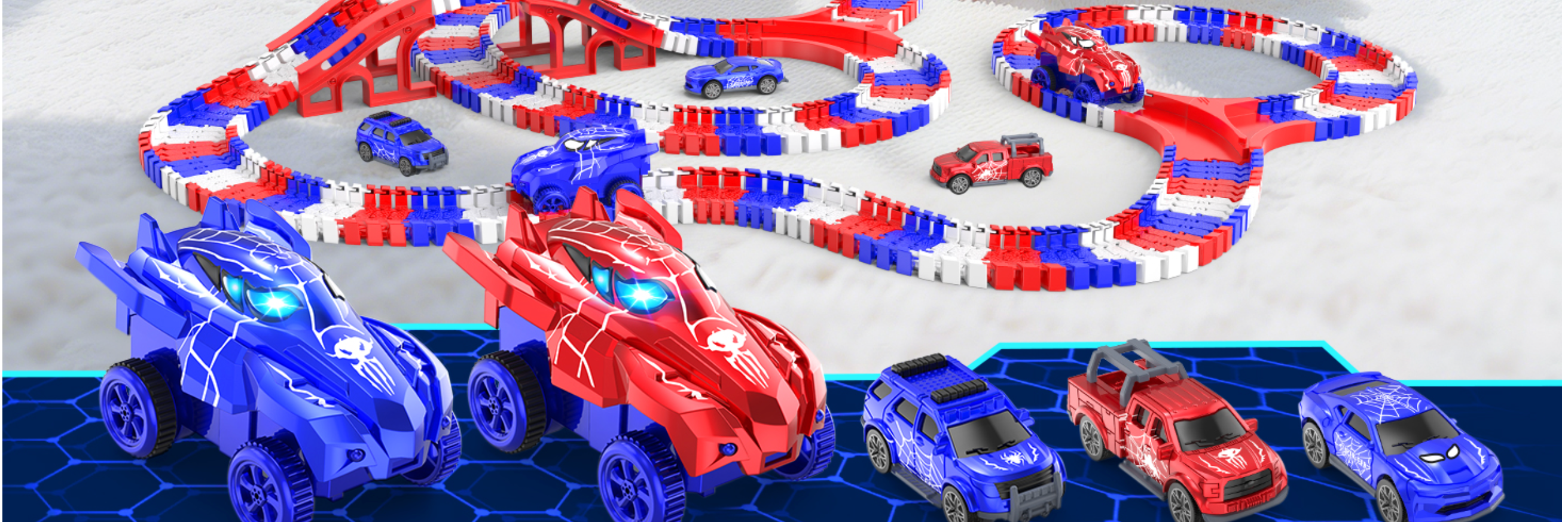Play Features: Flexible track shapes, dynamic obstacles, interactive car movement