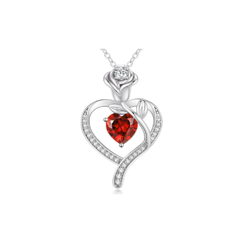 Sterling Silver Heart Pendant Necklace with Rose Design and Birthstone
